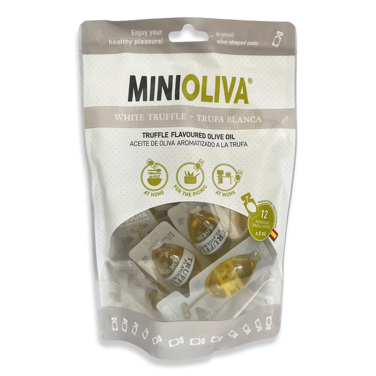 MiniOliva Truffle Flavoured Olive Oil single serve combines high-quality extra virgin olive oil with the distinctive character of truffle, creating a rich, aromatic and versatile product designed to elevate everyday dishes.