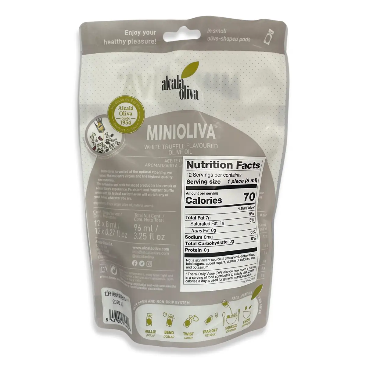 This practical stand-up doypack includes 12 individual portions (0.27 fl oz each), offering a hygienic and precise way to use flavoured olive oil. Each portion delivers the exact amount needed, helping to avoid waste while preserving flavor and aroma.